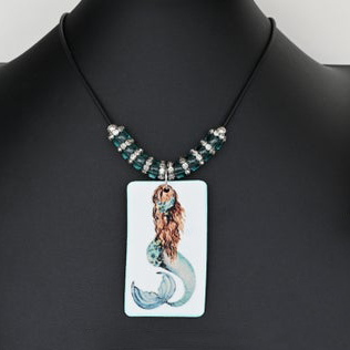 The mermaid design is loved by so many with the lovely flow of her tail in aqua tones accented by the aqua clear beads in the necklace.